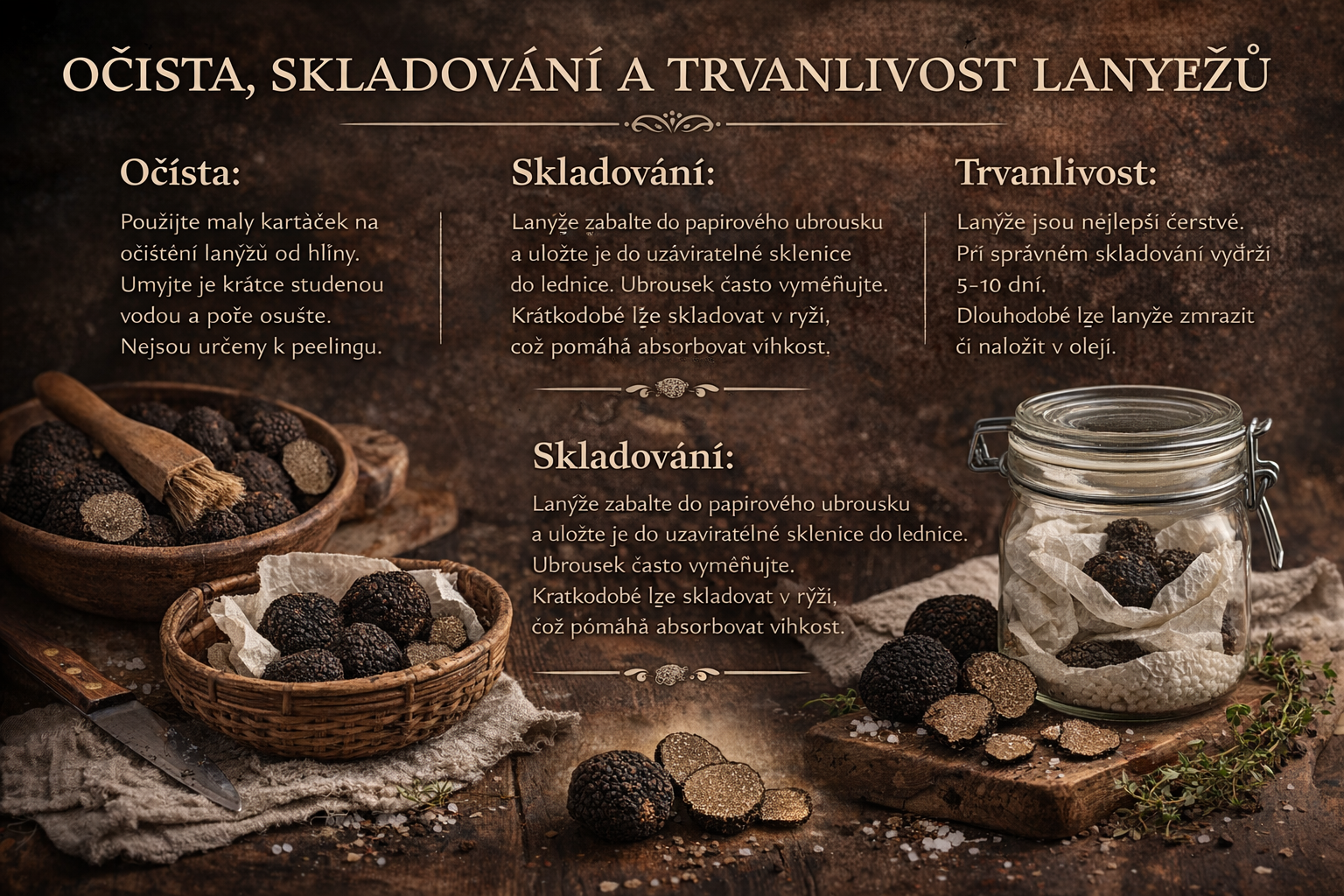 Skladování: Zabalte ho do papírové utěrky a vložte do uzavíratelné sklenice v lednici. Utěrku každý den měňte (lanýž "dýchá" vlhkost).